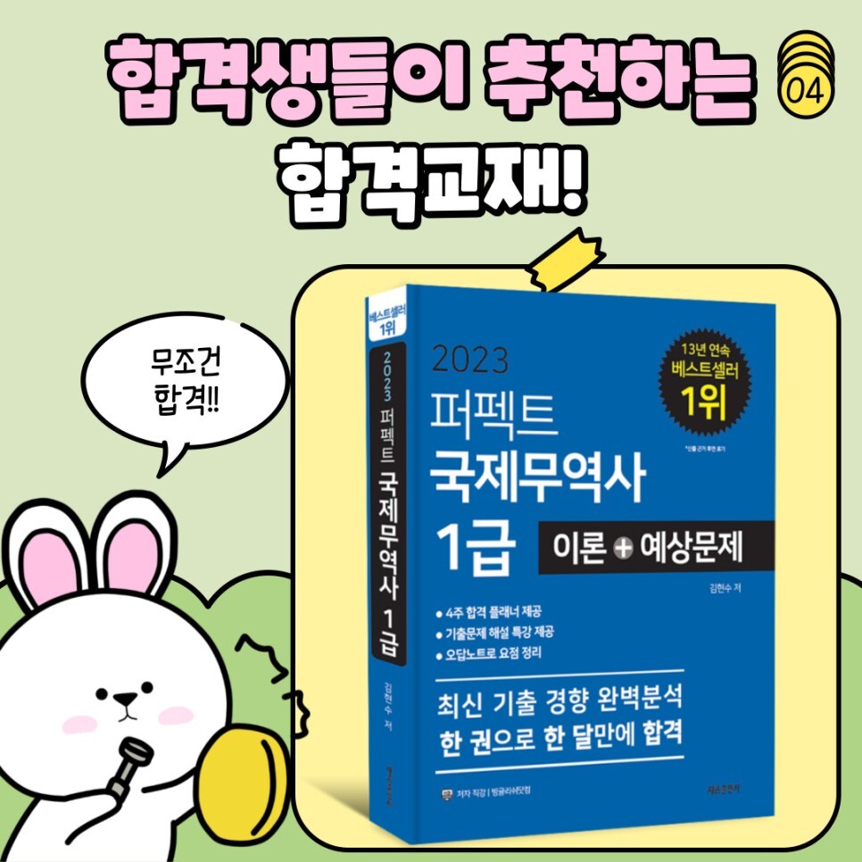 퍼펙트 국제무역사 1급 책으로 많이 공부하고 합격하고 있으며